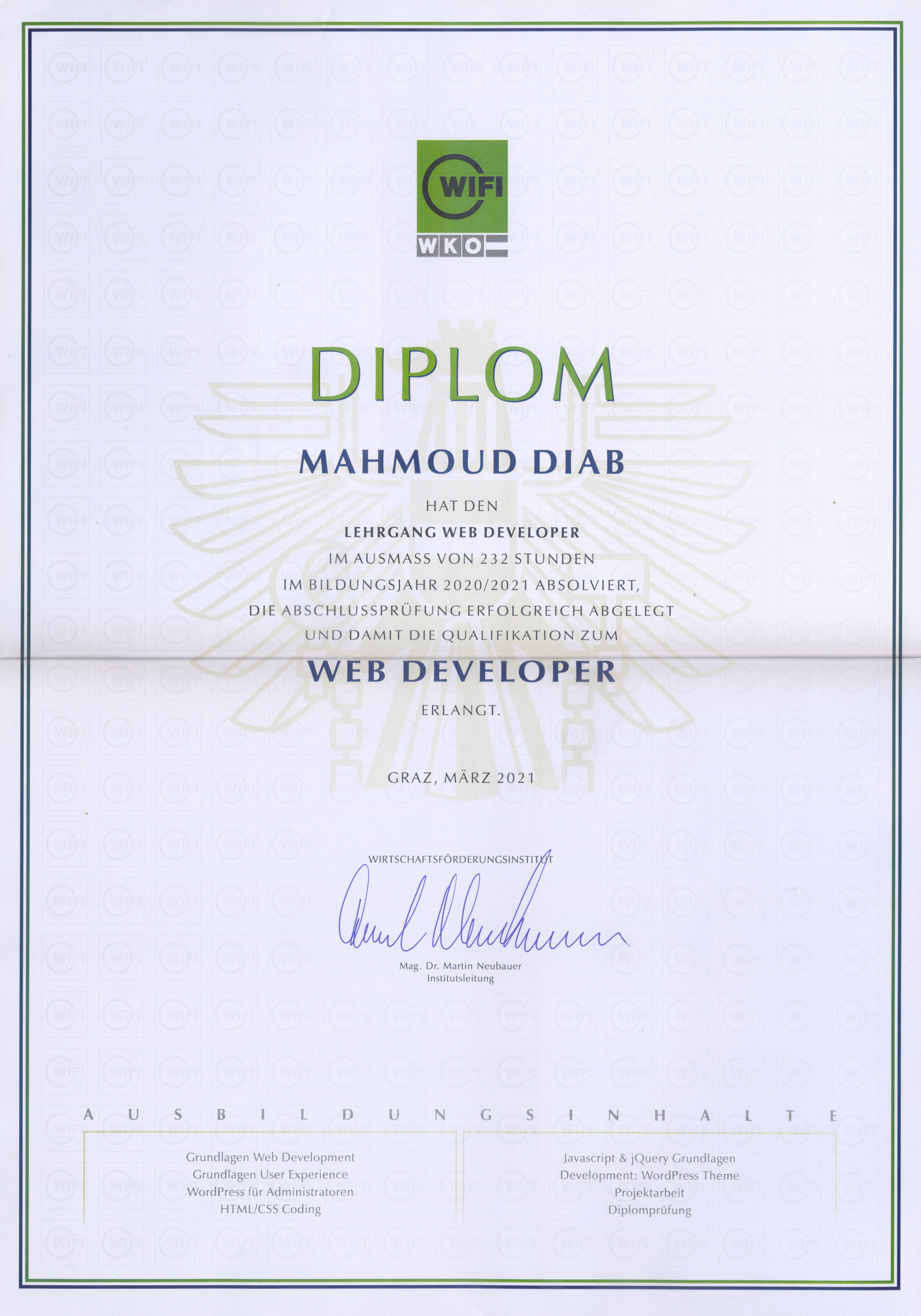 Ich bin ein engagierter Webentwickler mit einem starken Hintergrund in Programmierung, Datenbanken und Mediendesign. Meine Ausbildung zum Web Developer habe ich erfolgreich bei WIFI Steiermark abgeschlossen. Durch kontinuierliche Weiterbildung halte ich mein Wissen auf dem neuesten Stand und bin offen für neue berufliche Herausforderungen im Bereich Webentwicklung.